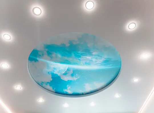 Эффект настоящего «звездного неба» достигается за счет светодиодов, расположенных за основным натяжным полотном. Различные формы, созвездия, мерцание «звезд», переливы цвета – создадут неповторимую атмосферу общения с живой природой у Вас дома.